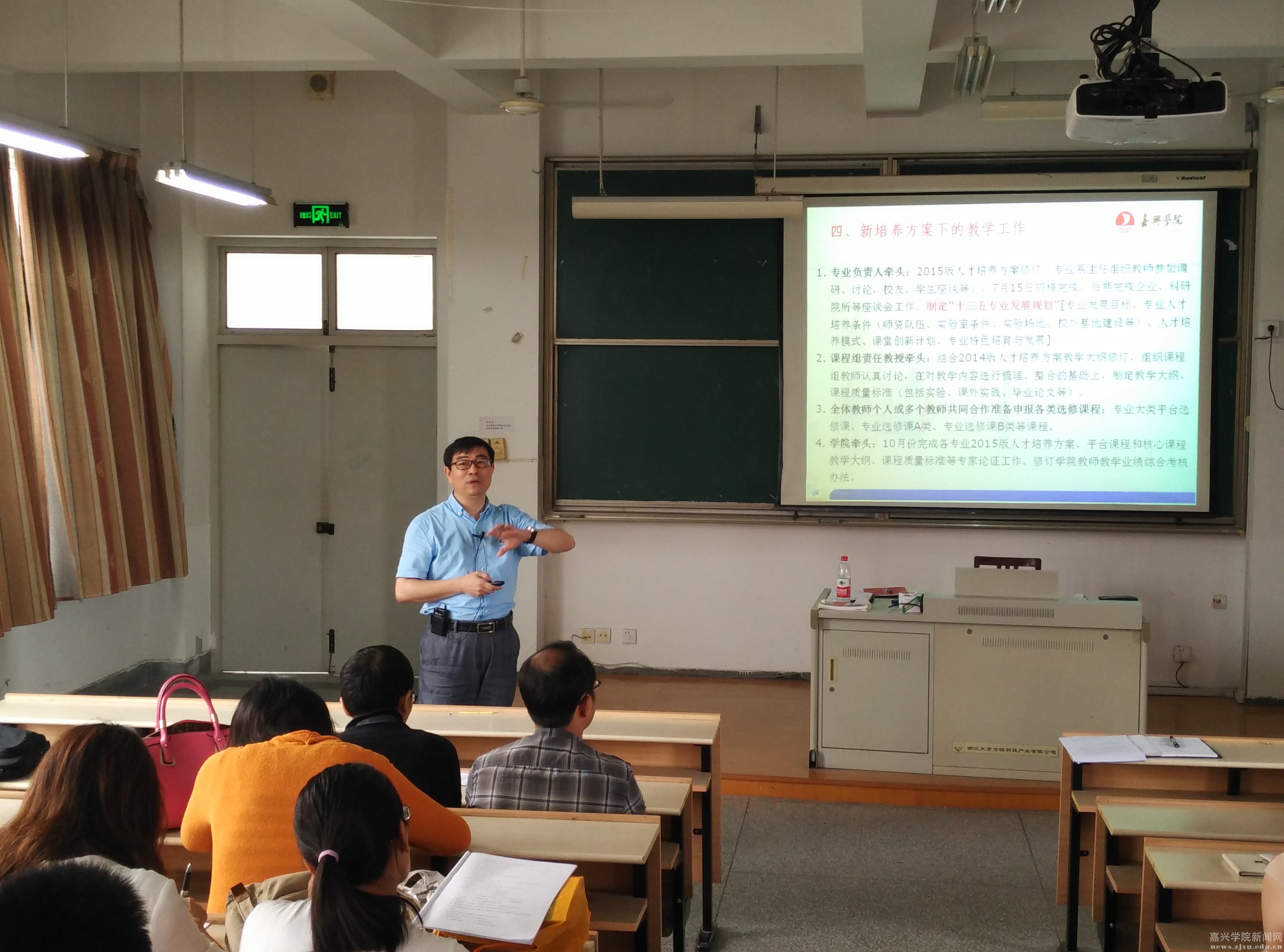 学院李蕾副院长作主题发言,他从校情、生情认识与需求着手分析了当前高等教育发展中面临的专业综合改革的大背景;全面梳理了2014版人才培养方案的育人理念;系统阐述了2015版人才培养方案的顶层设计思路并布置了新培养方案下的教学工作。