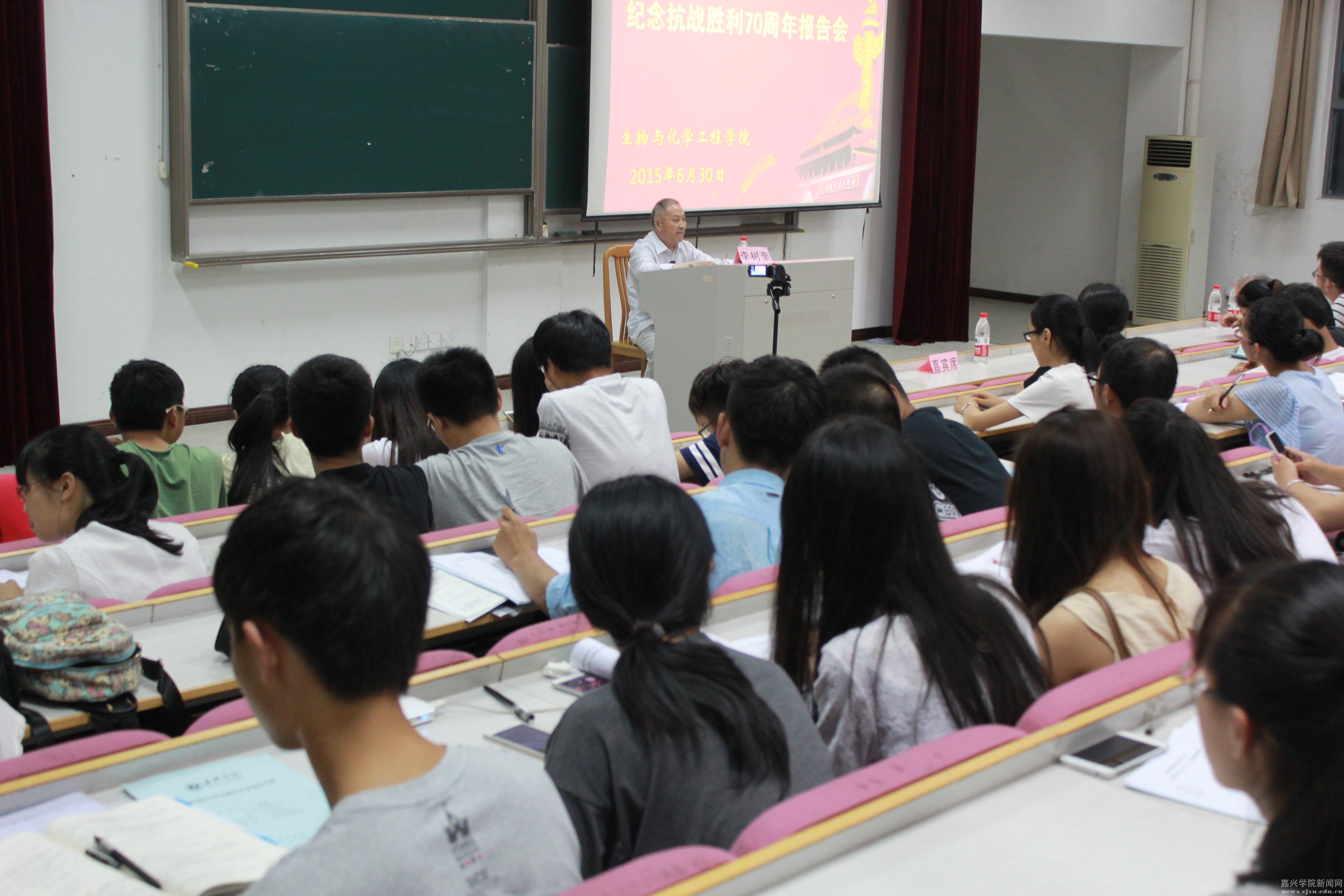 6月30日晚,生化学院在梁林7号楼报告厅举行了纪念抗战胜利70周年宣讲报告会,新四军研究会会长,原嘉兴市人民法院院长李树奎等应邀出席,生物与化学工程学院大一、大二年级共216人参加。李树奎在报告会上告诫青年学子要牢记历史,不忘教训,为国家振兴、为实现中华民族的复兴而努力学习,为实现“中国梦”而奋斗。由此,生物与化学工程学院2015暑期大学生纪念抗战胜利70周年宣讲实践活动拉开序幕。