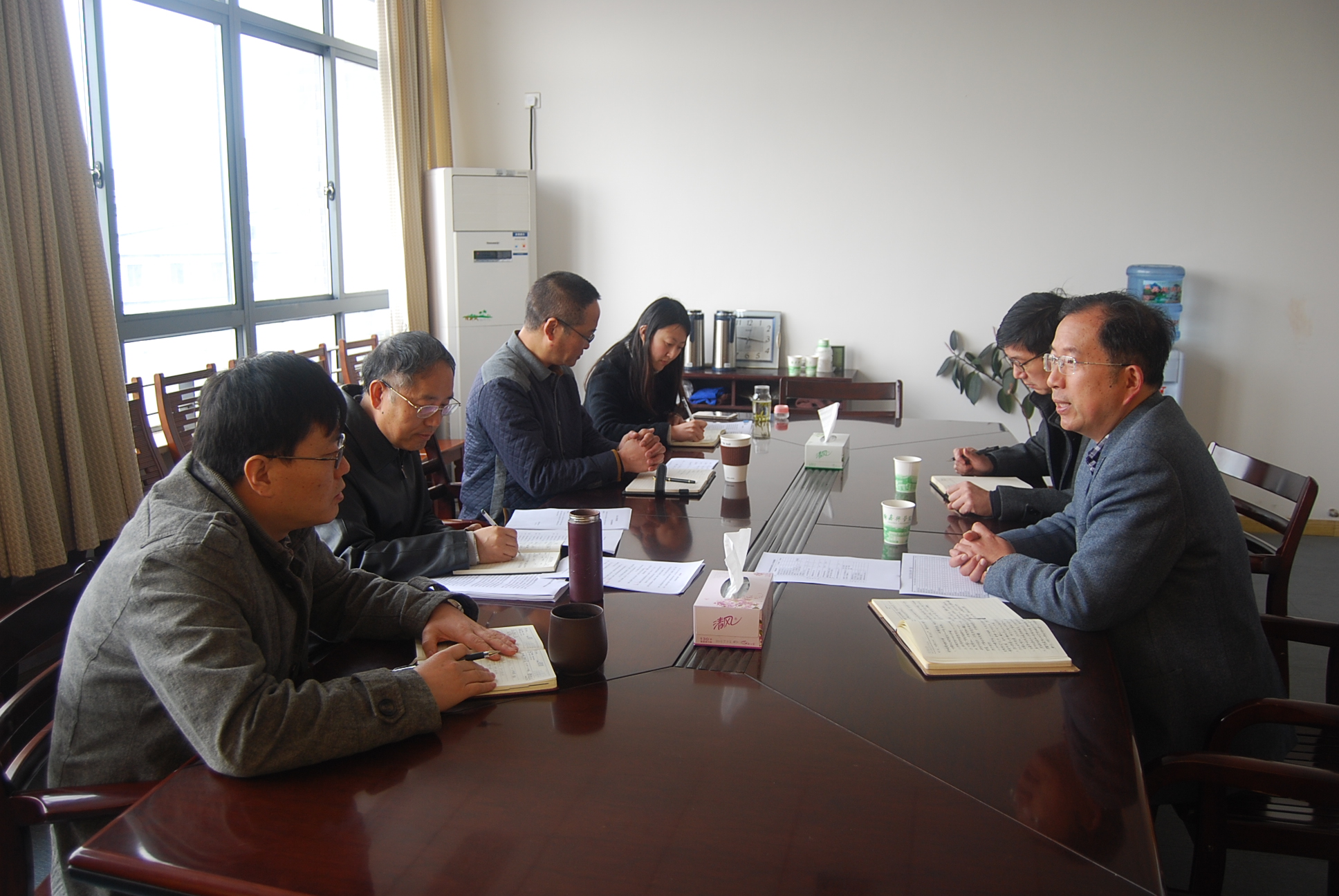 机电学院党委书记徐扬围绕学院目前基本情况,高端人才的引进、申报硕士点、申报国家级教学示范中心、“机电家园”建设以及学院对突破性指标的完成工作进行详细的汇报。左春柽院长对学院“十二五”规划完成情况和“十三五”规划的初步想法进行汇报。
