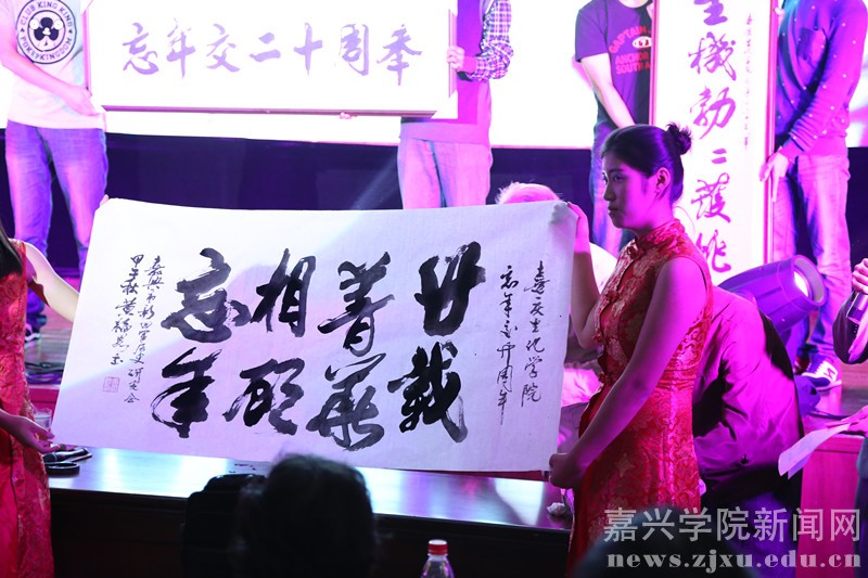 晚会尾声,黄韬略爷爷和生化1405班的施优媛同学老少两代,同时挥毫,为忘年交20周年庆典书写了主题“廿载菁华 相顾忘年”、“传承梦想 立志青春”。