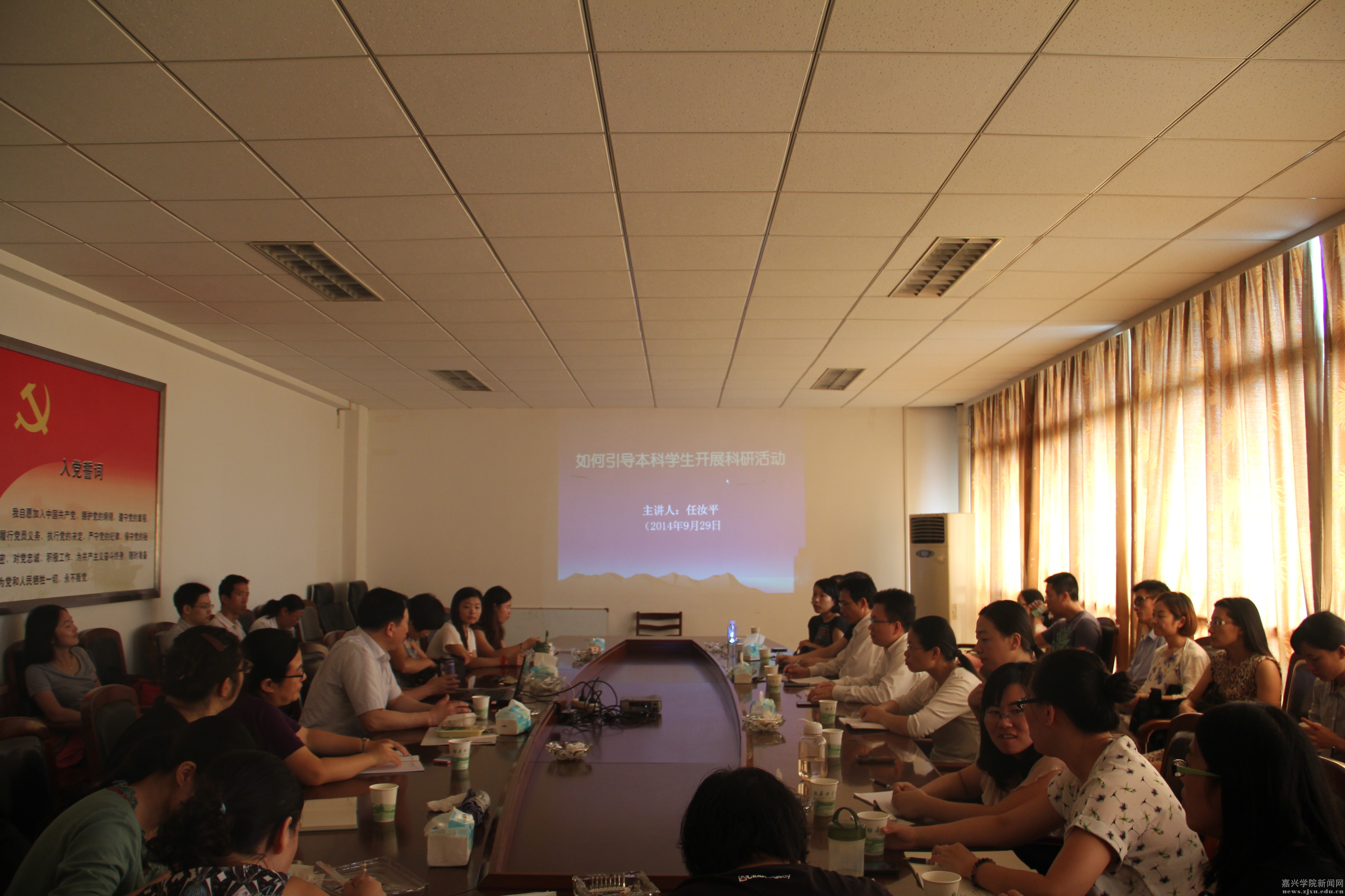 任教授结合自己多年来的实践,详细向在场的老师们说明了引导本科学生参加科研活动的必要性和可行性。他指出,引导本科学生开展科研活动,首先要注意的是过程与方法。具体包括:激发学生科研的动机和兴趣;指导和帮助学生选择科研课题;教会学生收集和分析相关文献资料;指导和帮助学生撰写论文大纲;指导学生撰写和修改论文文稿;指导帮助学生投递学刊发表。另外还要关注的是,引导本科学生参加科研活动过程中需要处理好的关系。包括:指导教师的主动性与学生能动性的关系;学生课题主持人与参加人积极性的调动关系;学生成长目标与指导教师目前功利的关系。