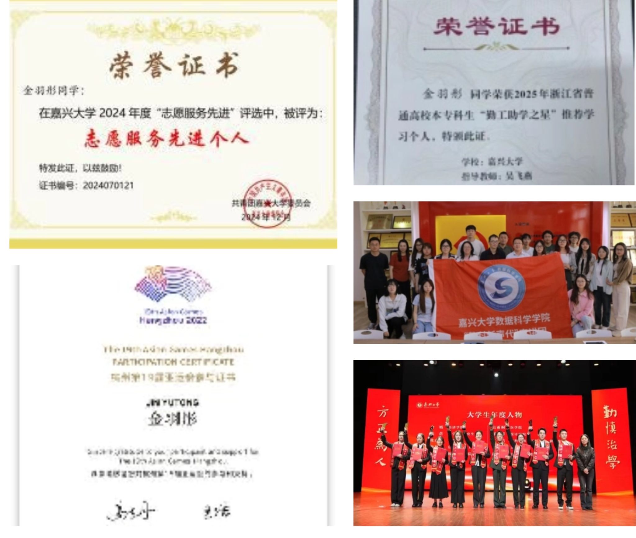 课业之外,金羽彤用服务师生和奉献社会生动诠释了自己的青春担当,个人也荣获嘉兴大学“志愿服务先进个人”“优秀学生干部”等荣誉称号。作为学院团委副书记,她发挥专业特长,组建数科“新声代”宣讲团,深入社区、中小学等开展“省身文化”宣讲40余场,惠及5000余人,让“数学之美”走进大众、影响更多中小学生;她将服务意识融入日常工作,牵头组织学院各种大型活动20余场,覆盖师生2000余人次。作为班长,她带领班级12次蝉联班团考核第一,斩获“标兵班级”“优秀团支部”荣誉称号,所在的数学212班以47%的升学率刷新学院纪录;同时担任新生班级助理,帮扶大一新生快速融入大学校园,用实际行动践行使命。作为志愿者,她参加了中国数学会2024年学术年会志愿服务、杭州亚运会嘉兴站火炬传递、嘉兴市“英才计划”公益活动等多项志愿服务。