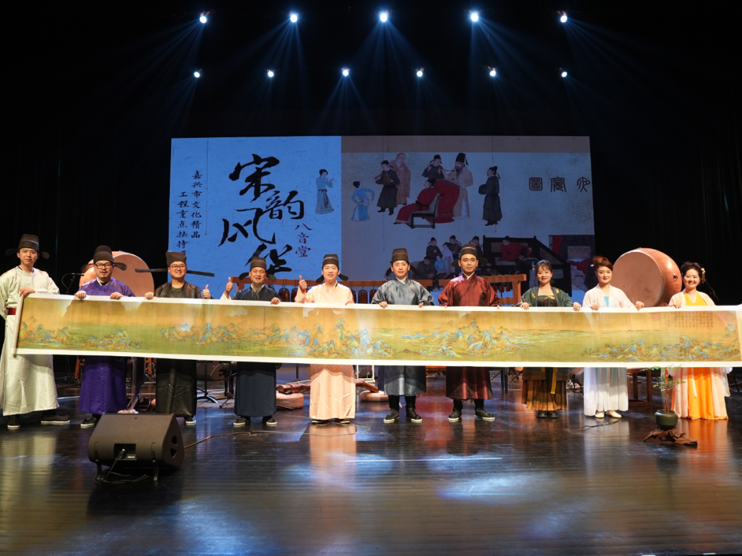“八音堂·宋韵风华”实景演奏会首次在嘉兴上演还是在2023年,整场演出所使用的乐器包括了复刻的宋徽宗制大晟钟,按照北宋陈旸《乐书》1:1还原的十三弦筑。此外,还使用了在宋代绘画中频繁出现的竖箜篌、筚篥、古琴和横笛等乐器。金、石、丝、竹、匏、土、革、木,八音齐聚,充分展现了北宋和南宋时期的音乐、舞蹈、乐器等表演形式,展示了“华夏民族之文化,历数千载之演进,造极于赵宋之世”的宋代美学。