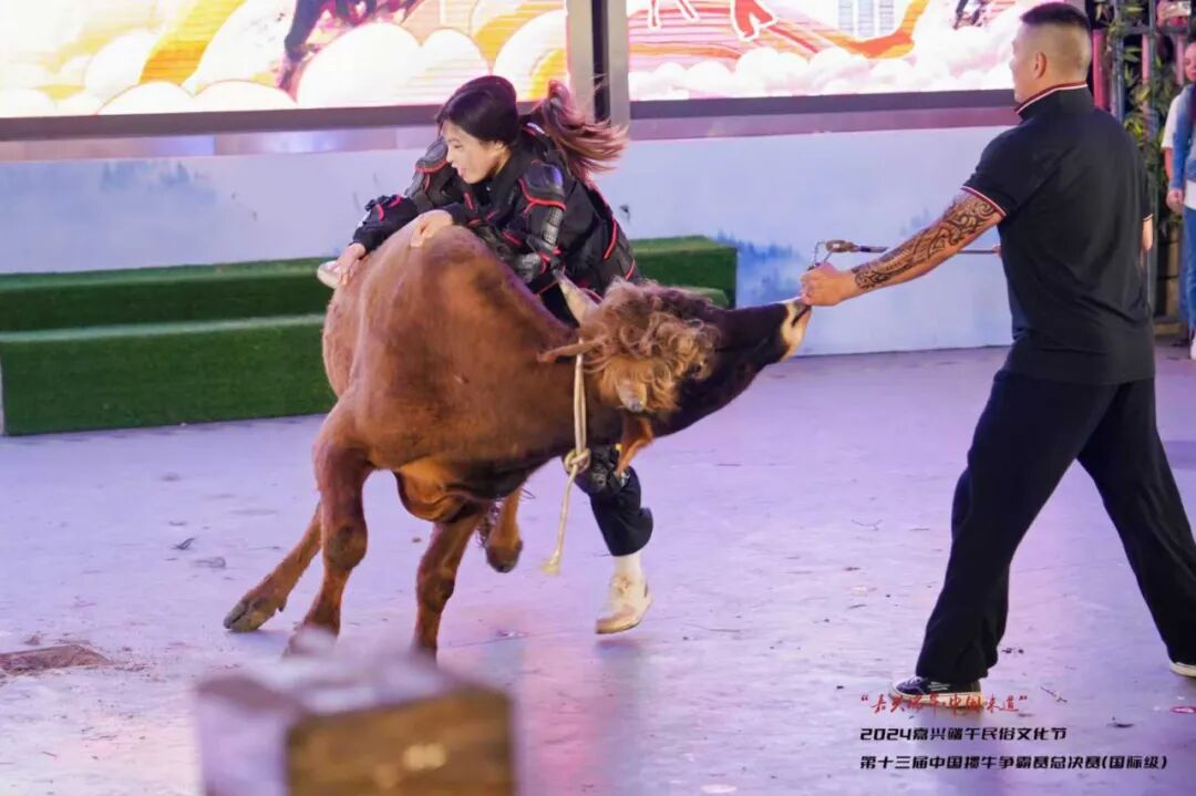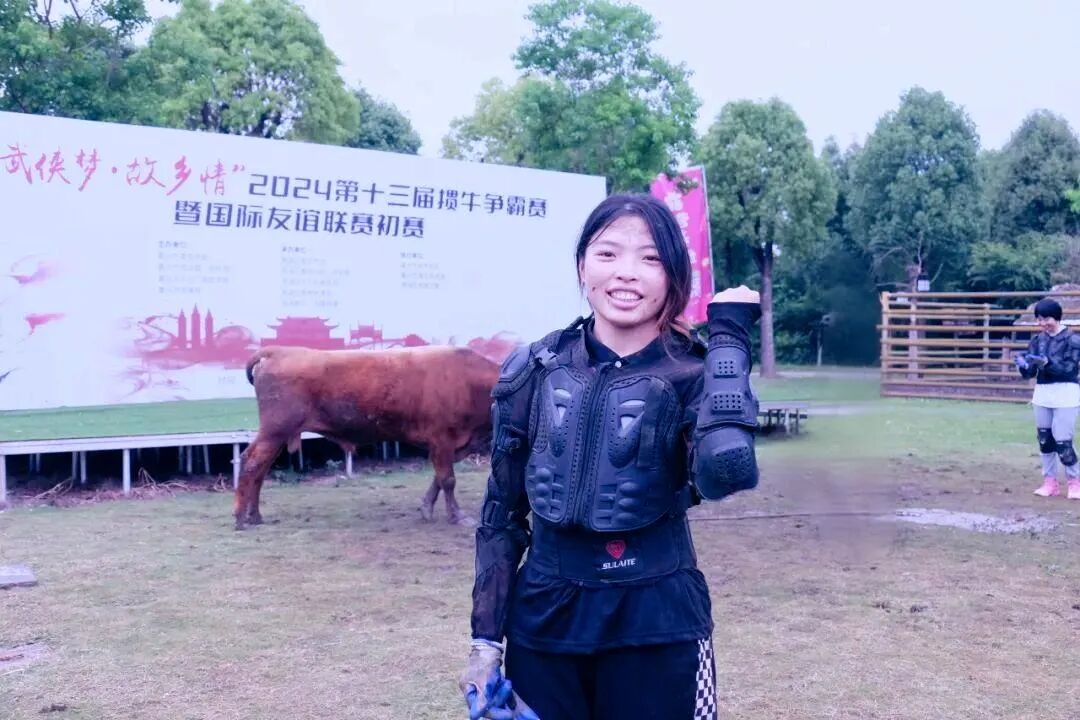 在第十三届掼牛争霸赛暨国际友谊赛联赛现场,令人惊奇的是,竟有一位看似文弱的女子在场上掼牛。只见她擒住牛角奋力下压,与牛僵持一番后,使用巧劲成功把牛掼倒。虽然马尾辫和衣服上都是泥,但她特别开心。