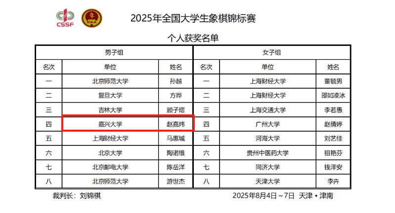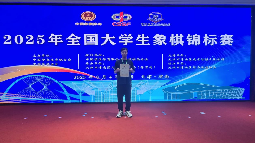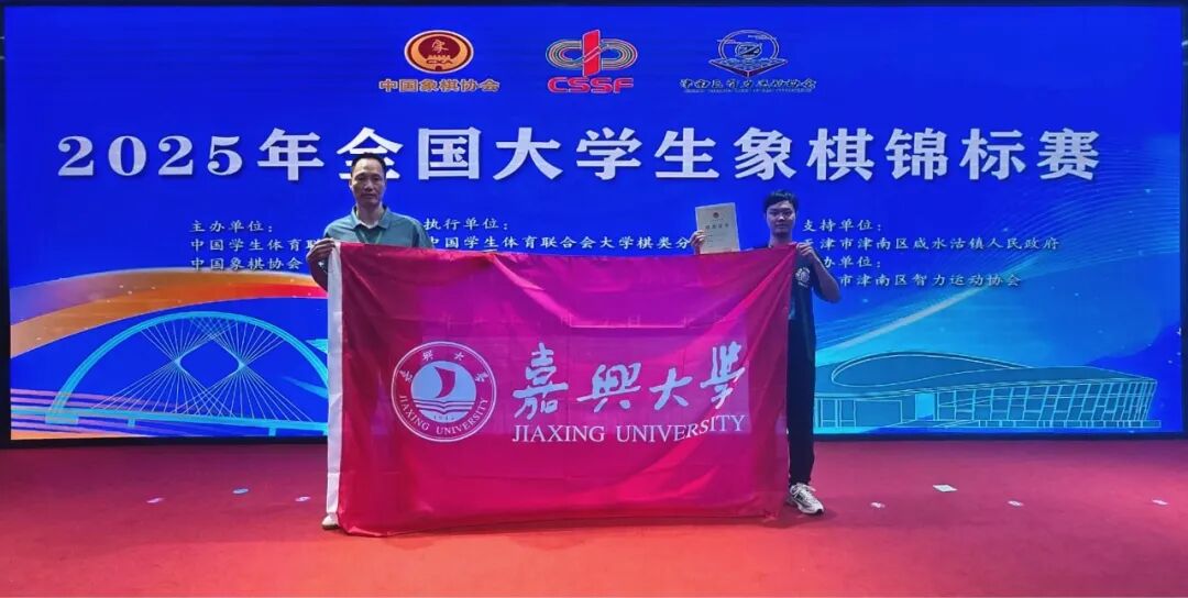近日,在由中国学生体育联合会、中国象棋协会主办的2025年全国大学生象棋锦标赛上,嘉兴大学数学与应用数学专业221班赵嘉炜同学,在学校体育与军训部王国飞老师的指导下,与来自42所高校的百余名棋坛精英同台竞技,经过四天九轮的激烈交锋,最终取得男子组个人赛全国第四名的优异成绩,为浙江省参赛高校取得的最好成绩。