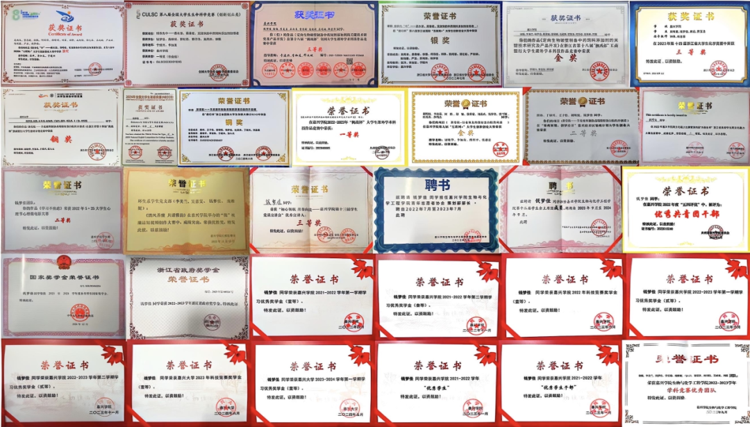 回到学校后,钱梦佳格外珍惜自己宝贵的时间,更加努力奋发,为自己航行的小船全面按下了“加速键”。学业上,她的综合成绩稳居前列,揽获国家奖学金等18项个人荣誉,获推省级优秀毕业生。科研上,她主持参与SRT、新苗、国创项目4项,申请发明专利2项,获学科竞赛类国家级奖项3项、省级奖项6项。实践中,她带领“小樱淘”实践团队为百名儿童开展性教育科普,获评校十佳团队;组织“循迹溯源悟初心”实践团走访8处红色基地,组织成员返乡传播嘉兴老兵口述故事;寻访30年来受益于“红色忘年交”的优秀校友等,在校期间志愿时长累计150多小时。她还担任了院学生会执行主席策划活动十余场,服务全院学子;担任班长期间推行“共成长”理念,带动全班申报科研项目30余人次,获竞赛奖项40余项,班级荣膺“标兵班级”。2023年12月,她在党旗下庄严宣誓,成为一名光荣的中共党员。