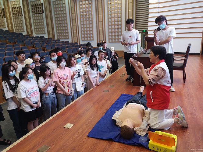 为进一步传播急救知识,提高突发情况应对能力,保障学生军训安全,6月18日,后勤服务中心(校医院)以学生军训为契机,邀请嘉兴市红十字会资深“急救培训讲师”朱明亚,在TCL报告厅开展2021级学生军训“急救知识讲座”,讲授急救方法及突发状况应对措施, 朱老师分别讲解了中暑的急救、心肺复苏的操作流程、AED的使用以及运动性损伤的救护,并现场模拟演练心肺复苏术及AED的使用,使同学对基本应急措施有了进一步的了解。 在朱老师的讲解下,同学们明确了自救与互救的意义,讲座取得圆满成功。