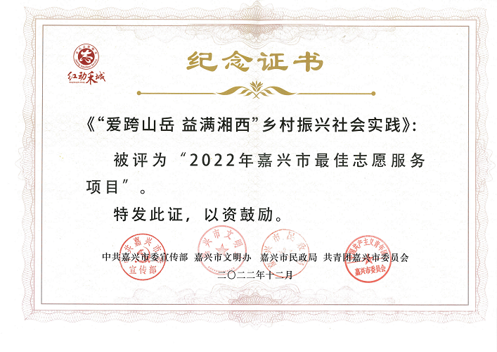 近日,在第37个国际志愿者日主题活动暨2022年度嘉兴市志愿服务最美(最佳)先进典型发布仪式上,我校“爱跨山岳 益满湘西”乡村振兴社会实践项目被授予“2022年嘉兴市最佳志愿服务项目”。