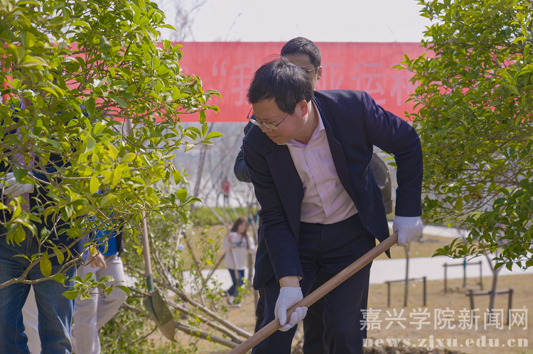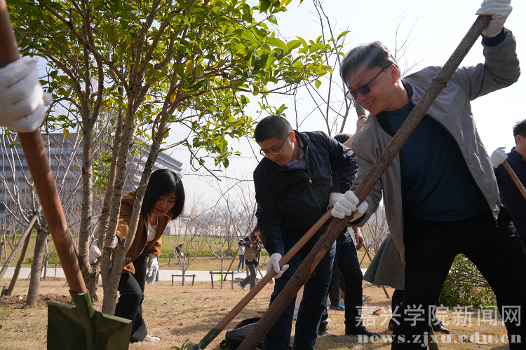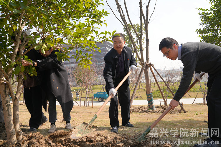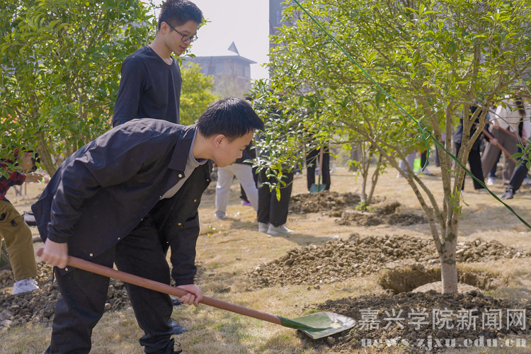 活动现场,广大师生挥锹铲土、扶苗填坑、提水浇灌,种下对学校的美好祝福和对未来的美好憧憬。经过辛勤劳动,新种下的20棵金桂树迎风挺立,为明媚的三月增添了绿意。 “种树之前,要疏松土壤,以便苗木扎根成活。栽种时,要扶正树苗,不留空隙的分层压实土球周边土壤。苗木栽植完后,要浇足定根水,最好再填上一层松土做成一个圆形围堰,便于以后浇水。”植树现场,绿化养护工作人员讲授了植树方法与步骤。 此次植树活动是学校劳动教育(公益服务)实践系列活动之一。2022年以来,学校坚持把劳动教育纳入人才培养全过程,将劳动教育与德育、智育、体育、美育相融合,发挥其树德、增智、强体、育美的综合育人价值和培育劳动素养的独特育人价值,开设了一系列劳动实践课程,推进了知行合一理念的落实,促进了学生全面发展。 各部门(单位)师生代表近百人参加活动。