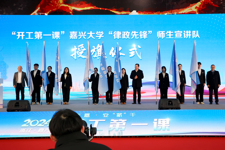 3月2日,在由嘉兴市人力资源和社会保障局和我校文法学院联合承办的“‘就’在嘉•安‘薪’干”——“开工第一课”活动启动仪式上,“开工第一课”嘉兴大学“律政先锋”师生宣讲队成立。校党委副书记吴云达宣布宣讲队成立,并向分队授旗。嘉兴市人民政府副市长邢海华,市人民政府副秘书长吴国明,市人力社保局党委书记、局长杨克建出席启动仪式。