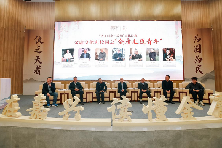 中国武侠文学学会副会长、苏州大学教授汤哲声,金庸先生“关门弟子”、浙江省社会科学院文学研究所原所长卢敦基,嘉兴市作家协会主席杨自强,国家级非遗“掼牛”传承人韩海华,我校党委宣传部张猛,金庸先生指导过的嘉兴青年作家蒋嘉骅等六位嘉宾和主持人、嘉兴市委统战部袁斐,围绕“金庸小说的文学地位和价值”等主题分别作了分享,并与现场学生进行了面对面交流。