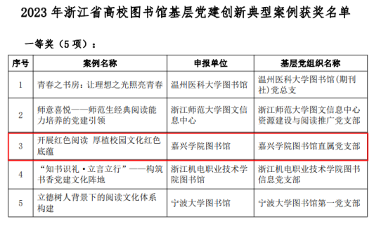 近日,2023年度浙江省高校图书馆基层党建创新典型案例获奖名单公布,我校图书馆直属支部报送的案例《开展红色阅读 厚植校园文化红色底蕴》荣获一等奖。