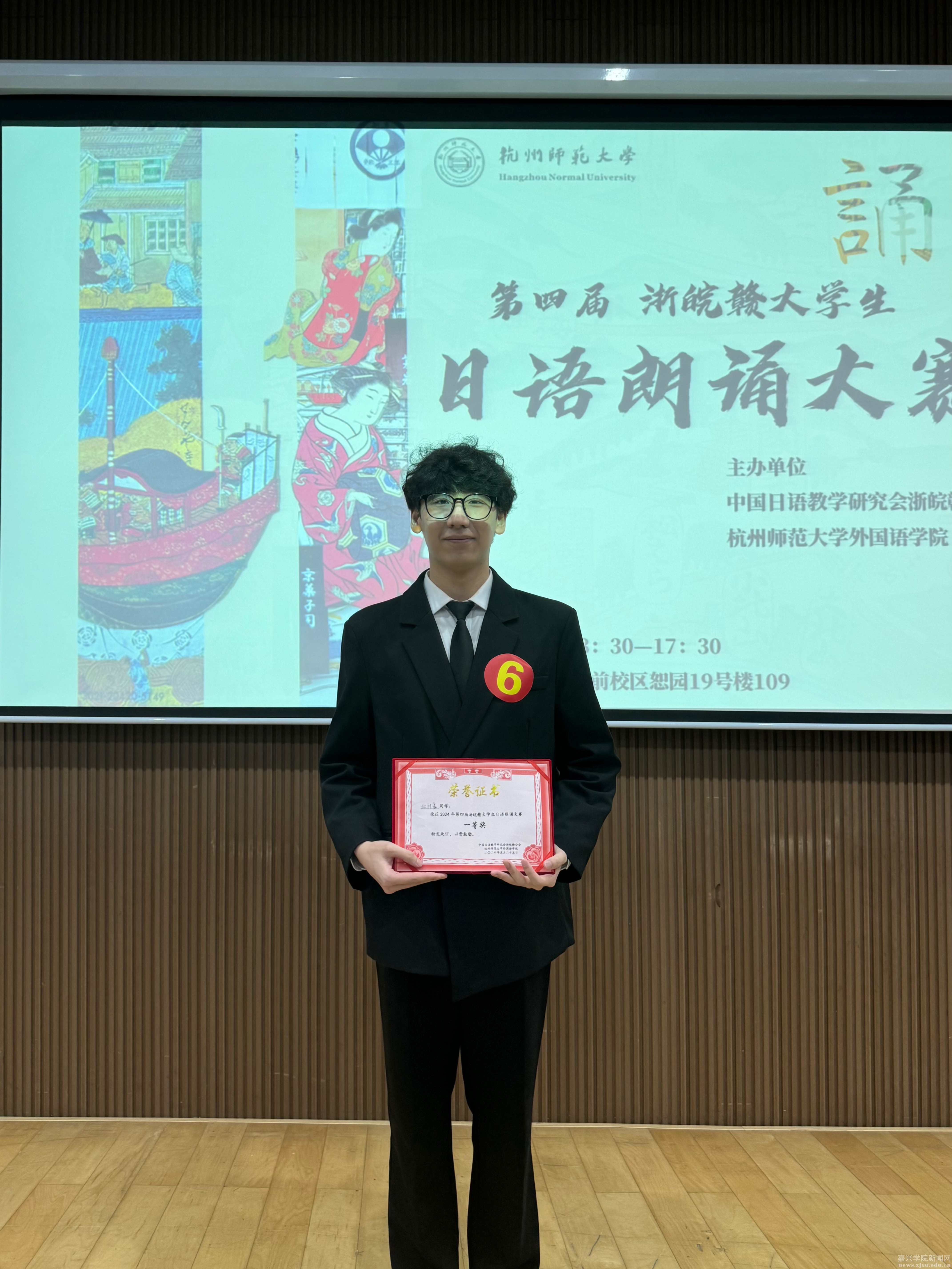 5月25日,在杭州师范大学举办的“第四届浙皖赣大学生日语朗诵大赛”中,我校日语专业杜利豪同学以其出色的日语朗读水平,荣获一等奖,夺得了该项赛事的最好成绩。