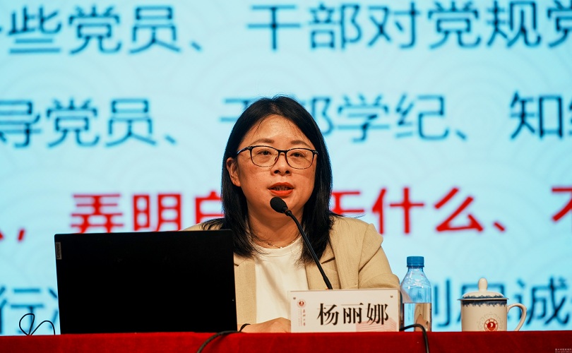 杨丽娜以“学党纪 守初心 勇担当 建新功”为主题进行《中国共产党纪律处分条例》的专题授课。她从什么是党的纪律规矩展开,重点讲解了百年党史中“纪律”、深刻把握新时代党的纪律建设新要求等内容,并向在场的预备党员学员提出了要在党纪学习教育中锻造青春“正”能量,做到学纪为先、知纪为基、明纪为要、守纪为本。