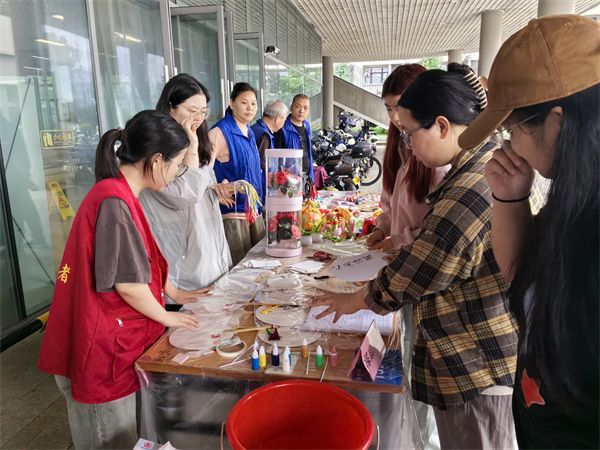 漆扇寄情,助残义卖。漆扇是以扇子为载体、运用国家级非遗漆染工艺、手工制染而成的艺术品。活动现场,志愿者们精心准备了漆扇体验活动,同学们积极参与、热情高涨,不仅锻炼了动手能力,而且感受了传统工艺的魅力。通过制作一把独一无二的漆扇,同学们在炎炎夏日体会到了别样的清凉与乐趣。此外,活动现场设置了学生寄语环节,同学们可以在寄语板上写下自己对未来的期许和对活动的感受。现场还设有爱心义卖活动,志愿者们精心准备了由“残疾人之家”制作的各种精美手工艺品,同学们通过购买这些物品来支持残健融合事业。每一笔购买都是一份爱心的传递,让同学们在享受购物乐趣的同时,为公益事业贡献了自己的一份力量。