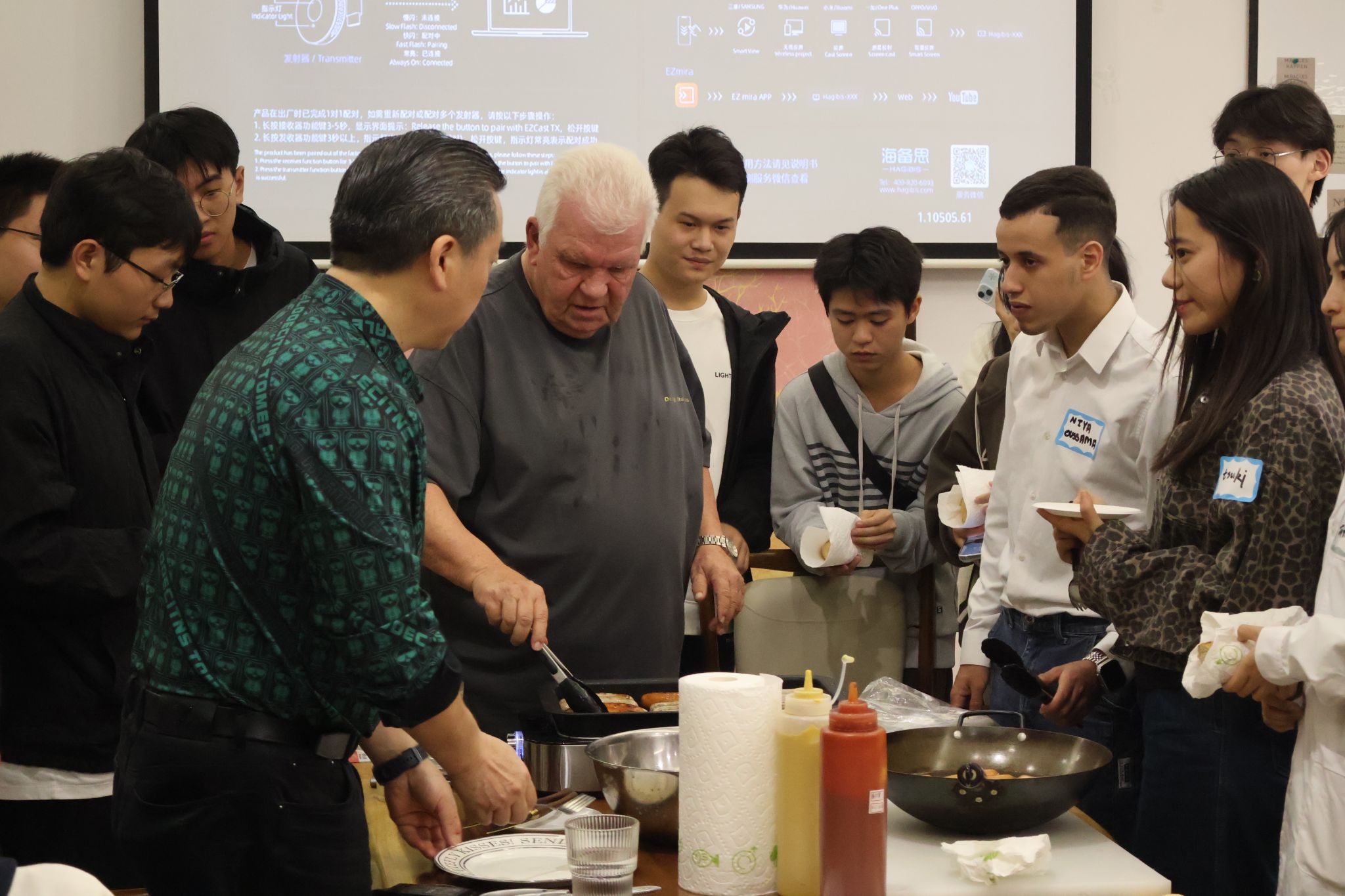 活动伊始,嘉兴市侨联副主席、长三角海创俱乐部(嘉兴)理事长兼尚书吧董事长龚海从自己的嘉兴情结切入,向同学们介绍了自己的留学生涯,以及为何回到祖国、回到家乡的心路历程,建议同学们深入了解和体验多元文化。随后,他分享了自己如何与德国美食结缘的故事。浙江德高国际文化交流俱乐部合伙人、德国美食家Wolfgang Meyer向同学们介绍了德国的主要美食,并现场制作了地道的德国烤肠,同学们纷纷自荐担当美食小帮手,现场气氛十分活跃,不仅品尝到了德式烤肠的美味,更是体验了外语交流的乐趣。