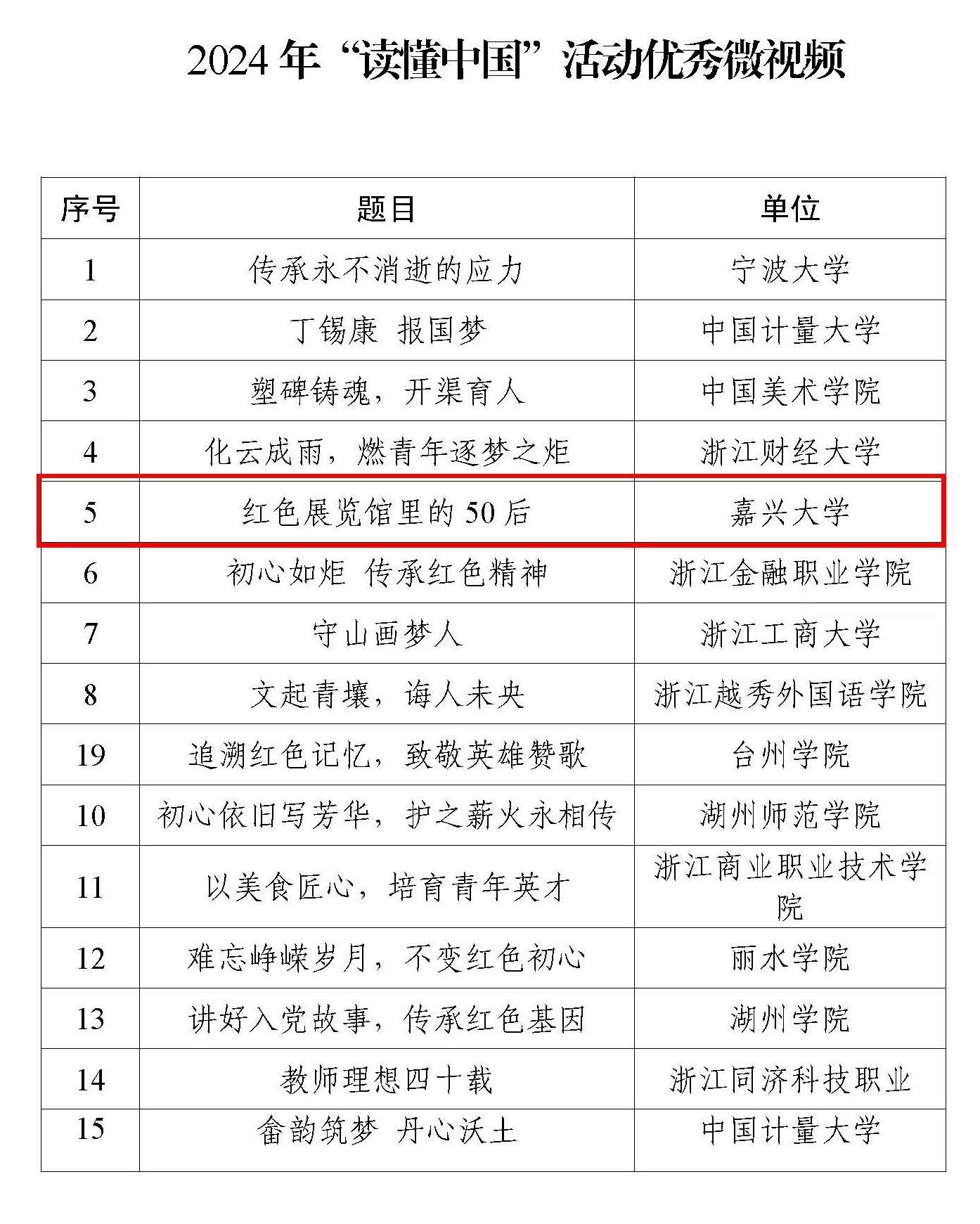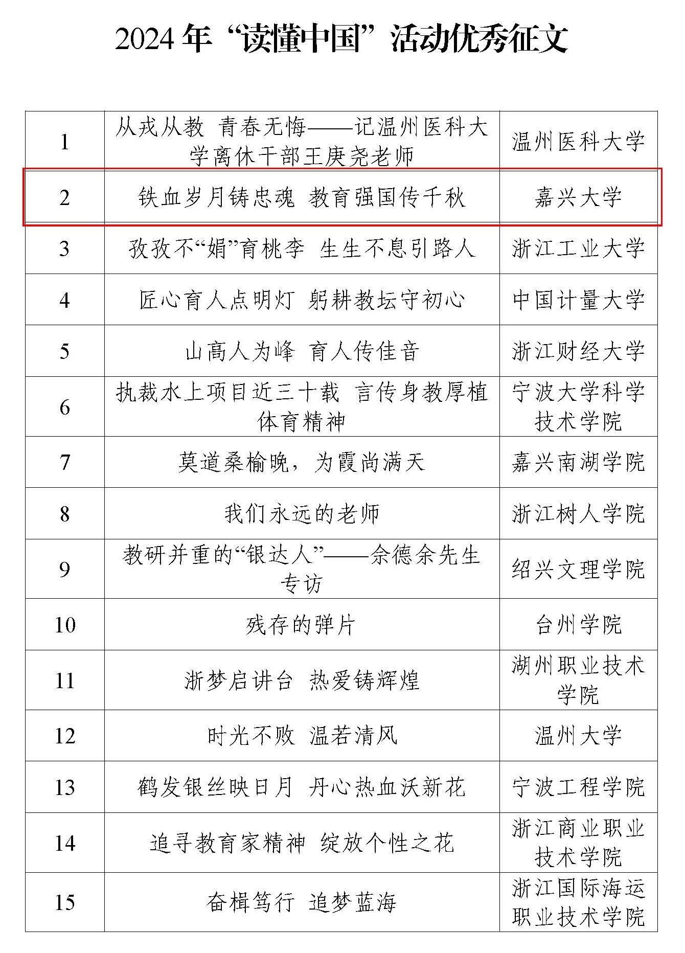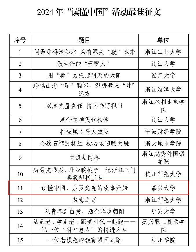 近日,浙江省教育厅关工委公布2024年“读懂中国”活动入选作品名单,我校选送的《读懂中国,从罗允尧的故事开始》获最佳征文(全省15个),《红色展览馆里的50后》获优秀微视频(全省20个),《铁血岁月铸忠魂,教育强国传千秋》获优秀征文(全省15个)。