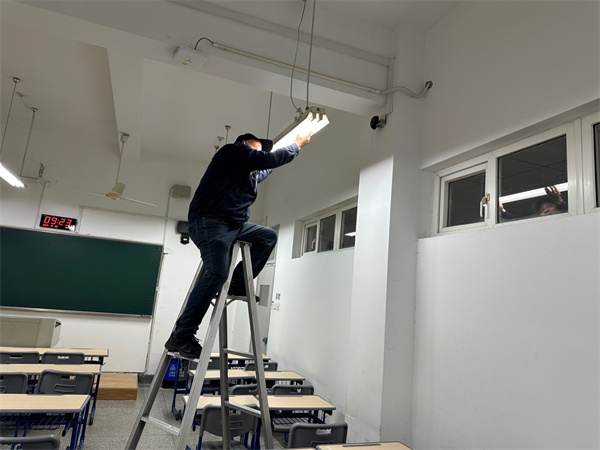 修缮服务部认真做好各考场桌椅、窗帘的检查维修,安排专人对全校高压变配电房、厢式变压器房进行了全面细致的检查;提前和属地供电公司联系,对校园外线路进行安全隐患排查,对所有考场及相关用电线路、照明灯具等水电设施进行检查维修,安排专人进行值班,确保研究生考试期间水电安全运行。