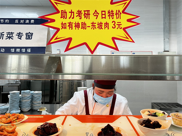 在考研关键时期,饮食服务部为考研学子们精心准备了一系列温馨周到的服务。12月20日至22日,校内各餐厅每日推出一款助力考研特价菜,如有神助“东坡肉”、展翅高飞“烤鸡翅”、如愿以偿“烧肉圆”,希望考研学子们以美食为笔,绘就成功上岸的绚丽画卷。此外,12月21日至22日午餐期间,饮食服务部特别安排了校园移动街景车配送“下笔如有神·锦鲤跃龙门”和“好风凭借力·扶摇上万里”两款祝福营养套餐至考场外,用美食的力量为考生们加油鼓劲;同时,校园移动街景车满载心想事“橙”和桂圆红糖姜茶,为考生们驱散寒意、暖胃暖心,祝愿考生们金榜题名、一举折桂。
