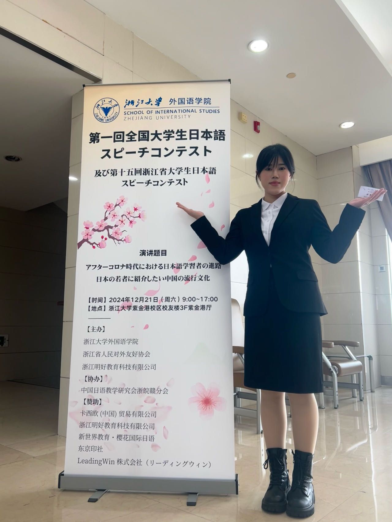 12月21日,在第一届全国大学生日语演讲大赛暨第十五届浙江省大学生日语演讲比赛上,我校日语专业学子陈越凭借出色的语言能力、深刻的主题阐释以及良好的现场表现,从全国众多优秀选手中脱颖而出,荣获全国二等奖。