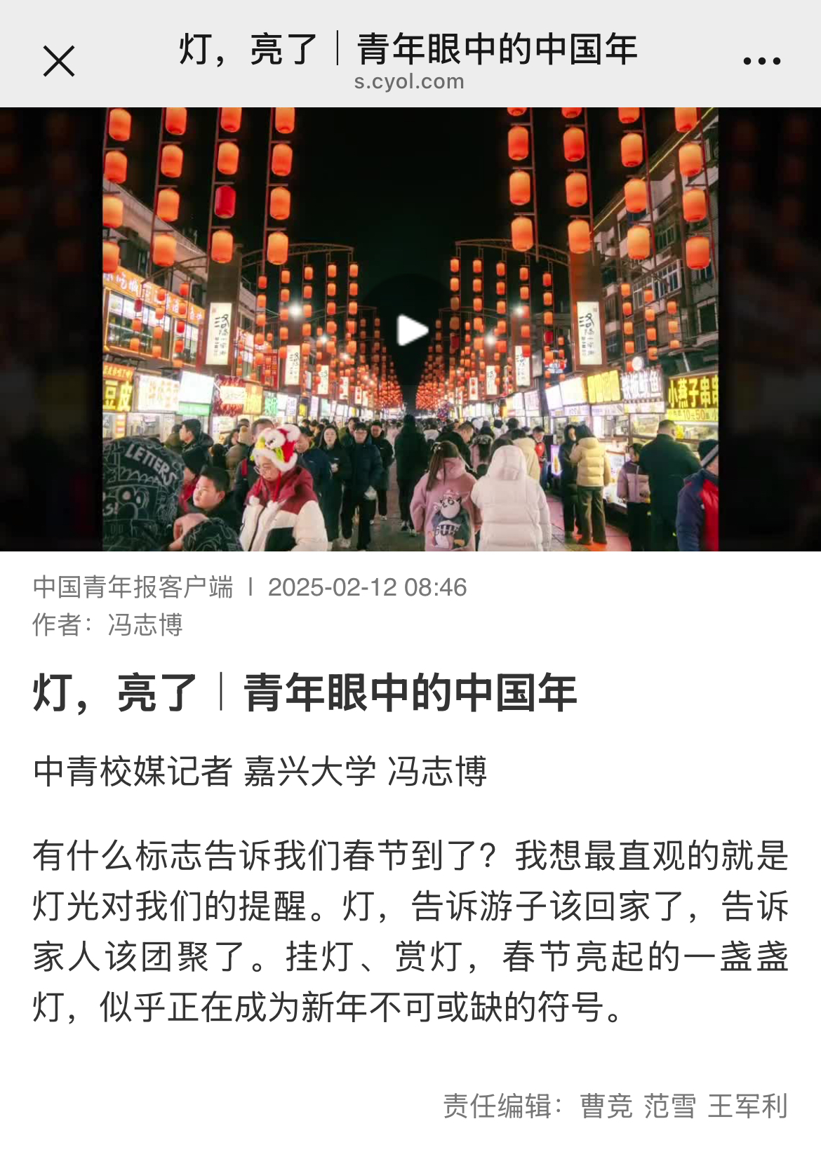 这是正月十五元宵节,中国青年报客户端推送的特别节目,推出自我校学子冯志博拍摄制作的短片“灯,亮了——青年眼中的中国年”。