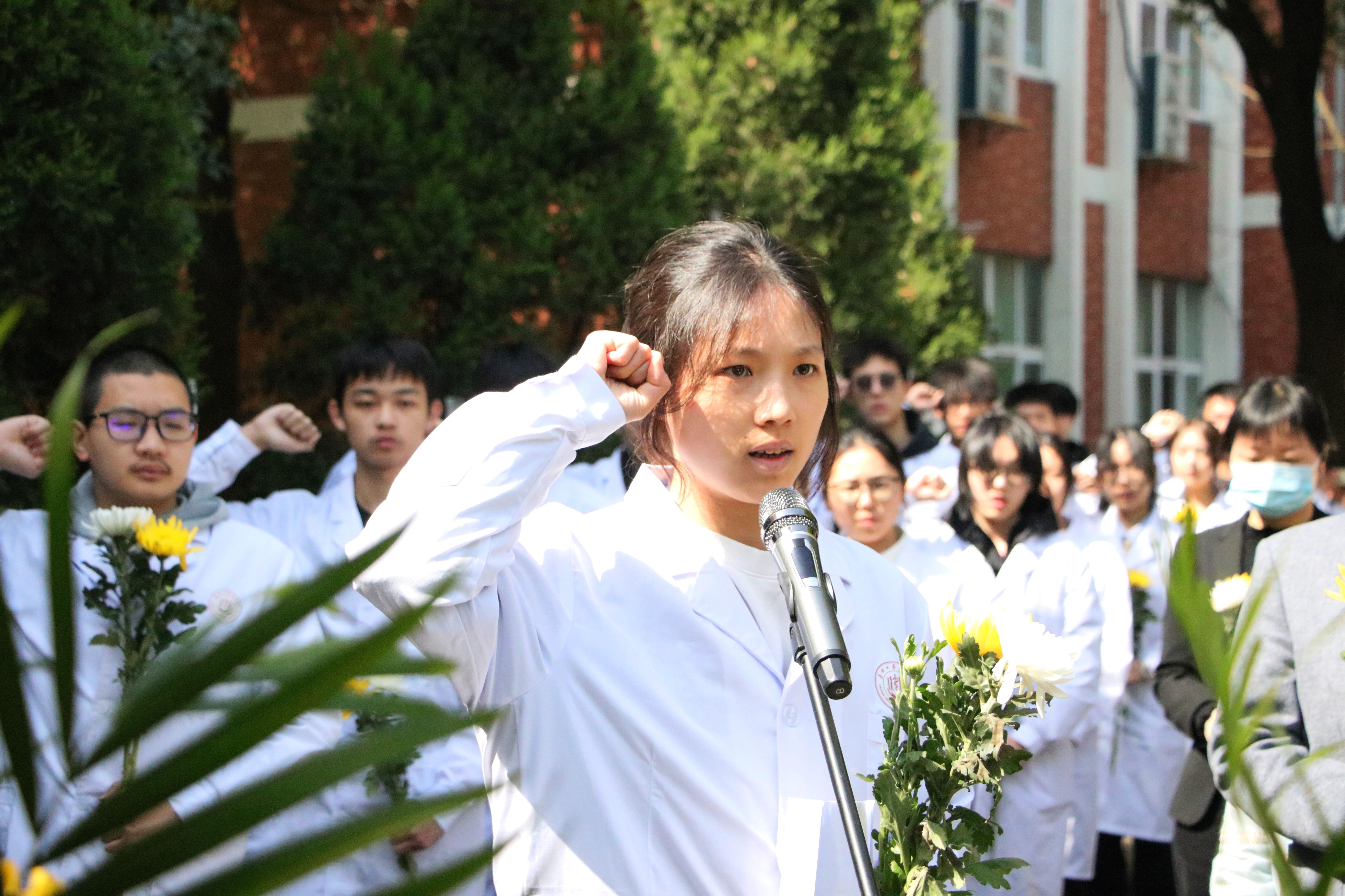 “我决心竭尽全力除人类之病痛,助健康之完美,维护医术的圣洁和荣誉,救死扶伤,不辞艰辛,执着追求,为祖国医药卫生事业的发展和人类身心健康奋斗终生。”全体在场的医学生举起右拳,面向无语良师碑庄严宣誓。