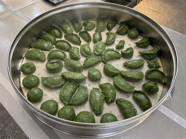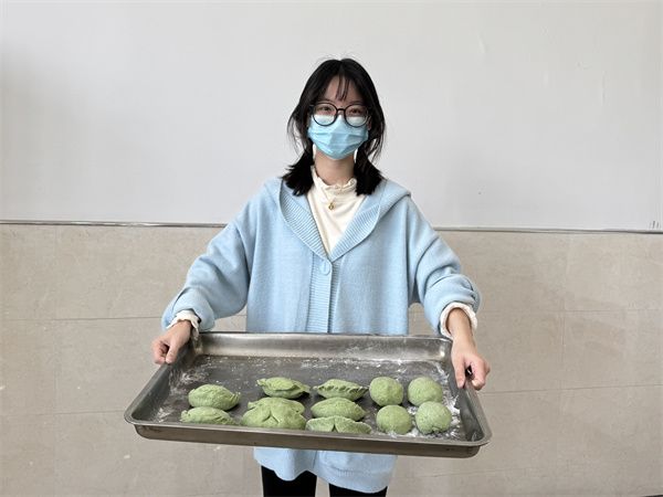活动中,梅园餐厅的2名资深面点阿姨一边熟练地进行揉面、切剂、包馅、成型演示,一边耐心地向同学们讲解每个步骤的要点与技巧,让大家对青团制作有了更清晰的认知。讲解结束后,同学们跃跃欲试,纷纷动手实践。在面点阿姨的悉心指导下,同学们制作的青团逐渐成型,它们身披绿色外衣,形态各异,或饺子形、或包子形、或三角形,充分展现了同学们的巧手匠心。