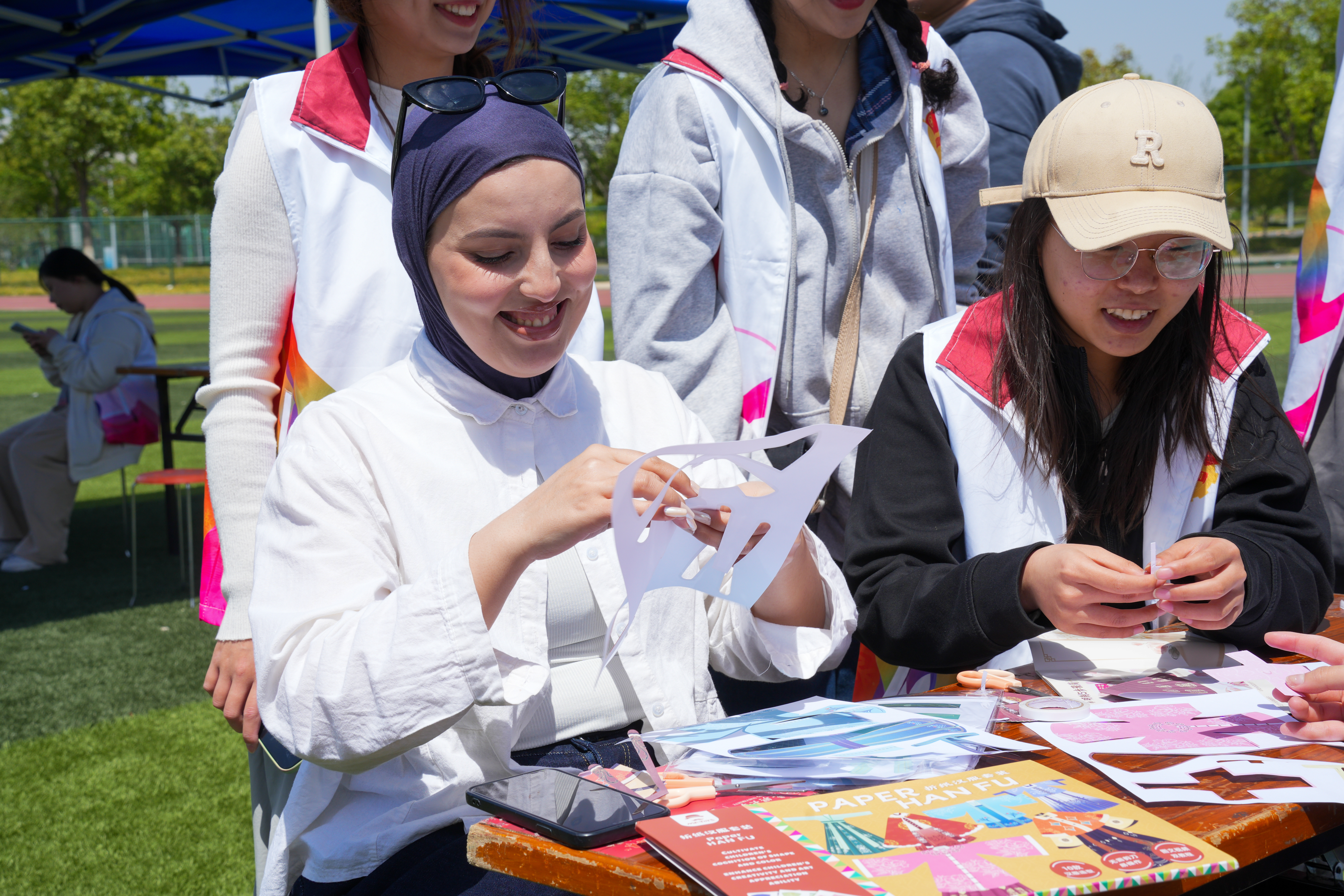 剪纸艺术体验区人头攒动,体验人员手持红纸与剪刀,用巧手剪出精美图案。汉服折纸区,同学们亲手制作迷你汉服,了解中华服饰文化。最受欢迎的是京剧脸谱拨浪鼓彩绘区,体验者参照经典角色进行创作。文化体验区熙熙攘攘,中外学生纷纷驻足参与,在互动中加深了对中华传统文化的理解与喜爱。
