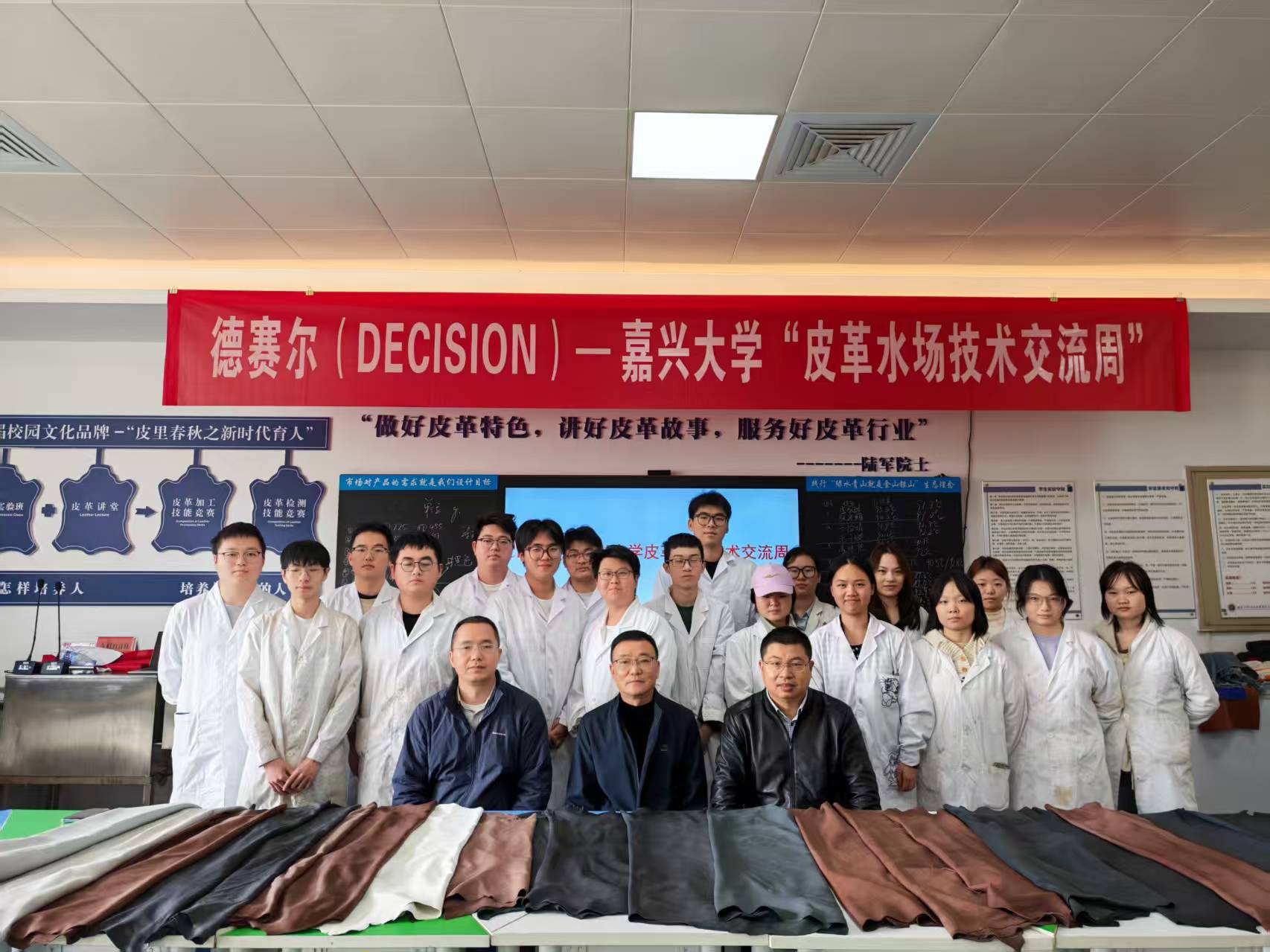 材料与纺织工程学院轻化工程专业于11月9日至21日举办2025年秋季皮革技术交流周。活动分为“德赛尔(DECISION)皮革水场技术交流周” 与“黎宁科技皮革涂饰技术交流周”,轻化221班全体学生及专业教师共同参与。活动由专业负责人罗建勋教授、马贺伟老师统筹组织。