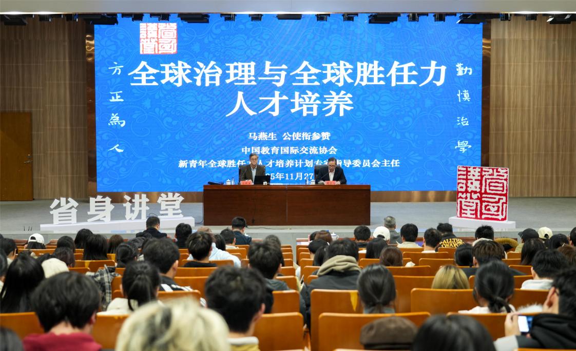11月27日,中国教育国际交流协会新青年全球胜任力人才培养计划专家指导委员会主任、中国驻法国使馆教育处原公使衔参赞马燕生应邀作客我校省身讲堂第152讲,作题为《全球治理与全球胜任力人才培养》的报告。副校长周宏伟主持报告会。