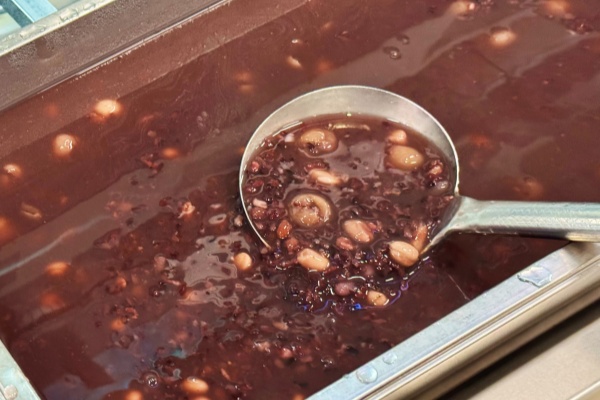 为保障供应,工作人员们早早来到岗位,精心挑选着糯米、红豆、红枣、莲子等十余种食材。他们细致地将食材洗净、分拣,随后置于锅中,以慢火细细熬煮。