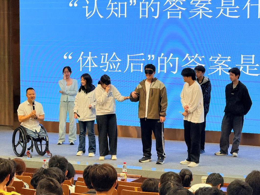 在讲座中,代国宏用自身的经历,向同学们讲述了生命教育的重要性。2019年退役后,他放弃了舒适的教练岗位,主动投身生命教育事业,成为神农架林区残创中心及华中科技大学等高校的生命教育导师,并成立个人工作室。他从“幸存者”转变为“摆渡人”,用亲身经历照亮无数迷茫的心灵,生动诠释了“生命的意义和价值是在别人需要的地方看见自己的责任”这一深刻内涵。代国宏邀请现场同学亲身参与“无手刷牙”“蒙眼行走”“轮椅行动”等活动。在模拟残障状态的过程中,同学们真切感受到了日常生活中的种种不便与艰辛,也更加深刻地理解代国宏多年来克服困难、奋勇前行的不易。