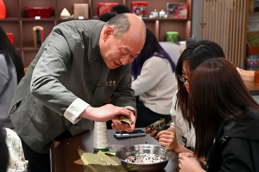此次课程是嘉兴大学首开《非遗创新与品牌运营》微专业的重要实践环节。作为嘉兴大学浙江省非物质文化遗产传承教学基地负责人,周琳长期深耕产教融合,此前已带领视觉传达设计专业学生开展“嘉兴大学设计学院×五芳斋非遗工作坊”,完成非遗体验馆馆标、IP“糯糯龙”表情包及系列文创成果。2024年双方签署战略合作协议后,从非遗工作坊到微专业的进阶路径日益清晰。本次教学中,非遗传承人胡建民不仅演示了四角粽的捆扎绝技,更分享了百年老字号通过品牌创新让非遗“活”在当下的实践经验。这种“高校教师+非遗传承人”的双导师模式,让同学们直观学习了“非遗+商业+文旅”的创新运营逻辑。