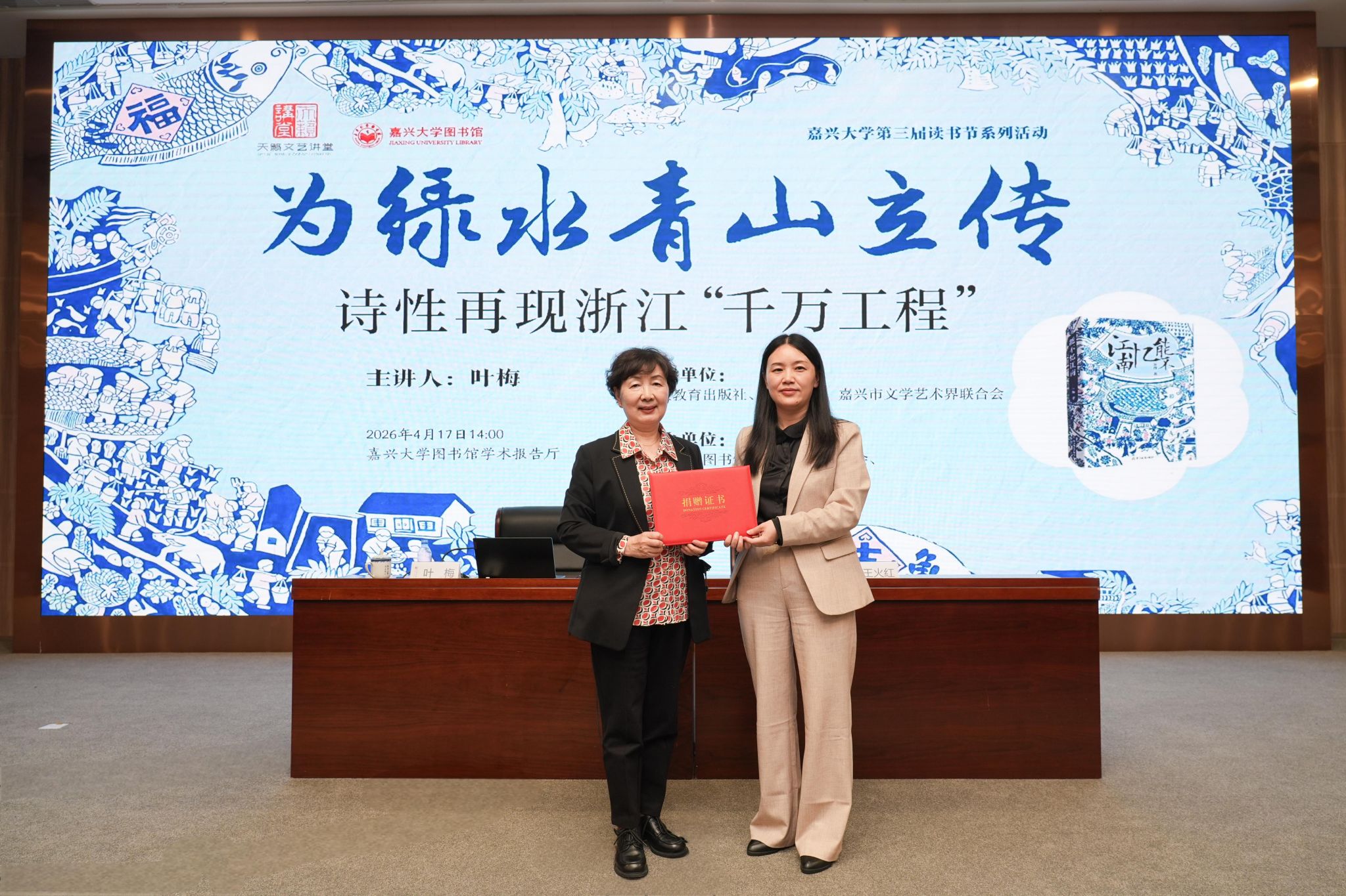 讲座现场,叶梅向学校捐赠了《能不忆江南》书籍,王火红代表学校为其颁发捐赠证书,以表感谢。