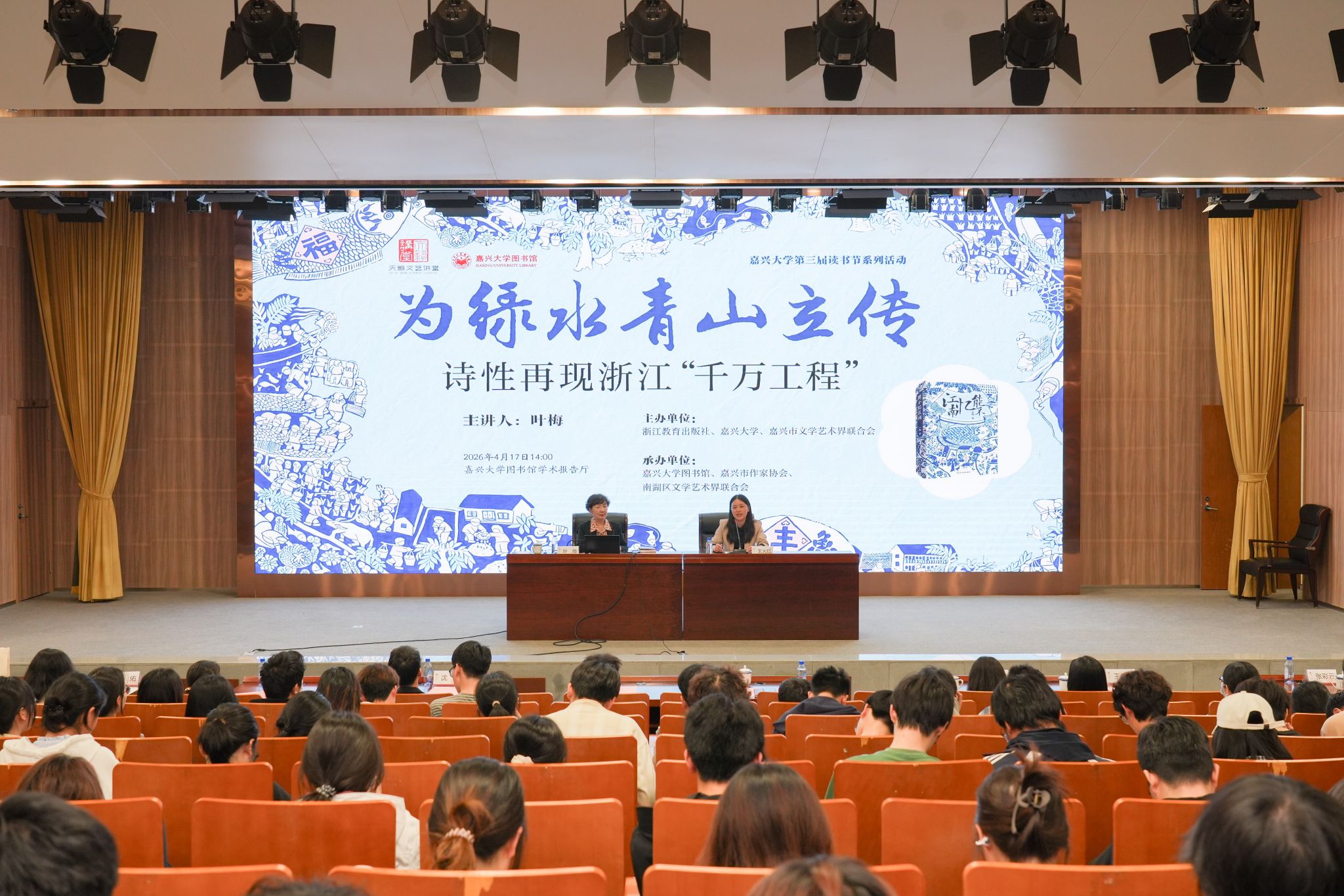 本次讲座是学校第三届读书节的重要文化活动,由浙江教育出版社、嘉兴大学、嘉兴市文学艺术界联合会主办,嘉兴大学图书馆、嘉兴市作家协会、南湖区文学艺术界联合会联合承办。学校师生代表、嘉兴市文学爱好者等到场聆听。