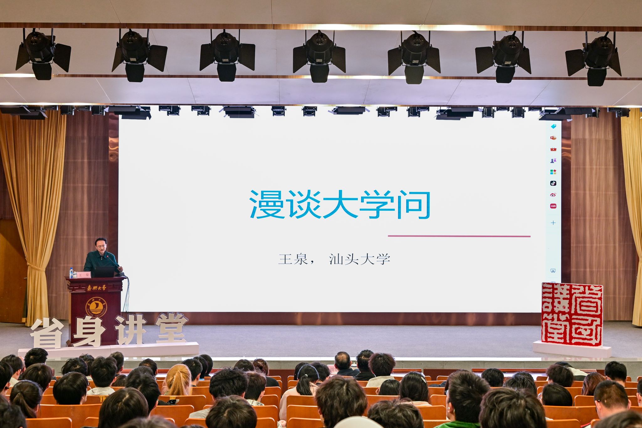 王泉从人类对外部世界的认识和对自身价值与美德的追求出发,提出“什么是真正的大学问”这一核心问题,引发在场师生的深入思考。他通过对科学的应用价值、文化价值和精神价值的系统阐释,深入剖析了大学问求知之路是一个不断发展、需要独立自由见解与奇思妙想的动态过程。王泉指出,追求大学问能够帮助我们培养兼具哲思的科学与人文气质,改变认识世界的方式与角度。他勉励嘉大学子要秉持独立精神,不随波逐流,在求知道路上勇于探索、敢于创新,努力成为既有科学素养又具人文情怀的时代新人。整场讲座故事性强、深入浅出,王泉院士以其深厚的学术积淀和开阔的学术视野,为师生们带来了一场思想与智慧的盛宴。
