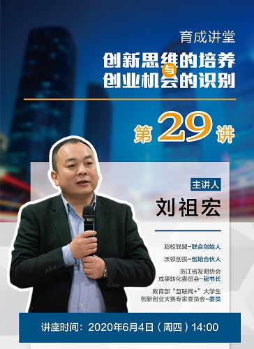 6月4日下午,超校联盟联合创始人、沃领创投创始合伙人、教育部“互联网+”大学生创新创业大赛专家委员会委员刘祖宏应邀作客育成讲堂第29讲,作了题为“创新思维的培养与创业机会的识别”的“云”讲座。近千名师生参加讲座。讲座由创业学院主办,生化学院承办。