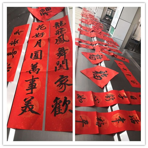 活动现场翰墨飘香,洋溢着新春祥和的氛围。书法爱好者现场泼墨挥毫,大红的纸张配上雄健遒劲的正楷、矫若惊龙的草书、形如流水的行书, 纷纷寄托着对新年的美好祝福。前来领取春联和“福”字的职工络绎不绝,现场有事先写好的春联、“福”字、“招财进宝”字向职工发放,职工也可自选或自拟春联内容,由书法爱好者现场书写。大家捧着一幅幅精美的春联、一个个喜庆的“福”字,喜悦之情溢于言表。