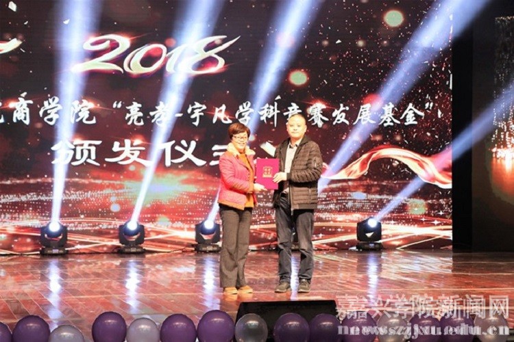 晚会现场,还举行了2018年商学院“温暖奖学金”、“嘉泽学科竞赛发展基金”和“亮孝-宇凡学科竞赛发展基金”三大奖项的颁发仪式。副院长李郁明、顾骅珊分别向叶增水和徐正良两位爱心人士颁发捐赠证书。