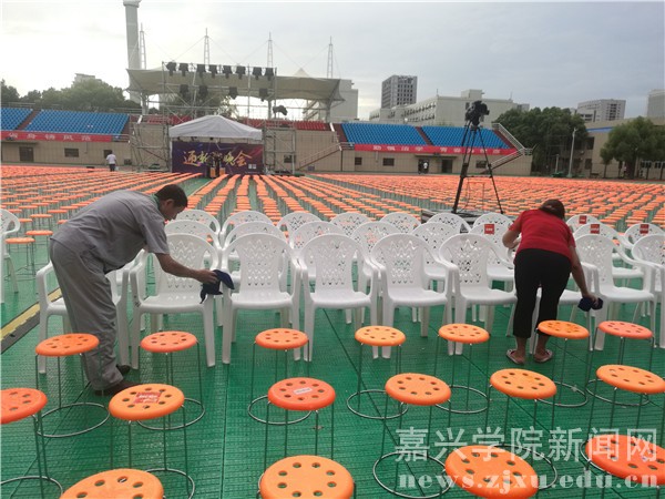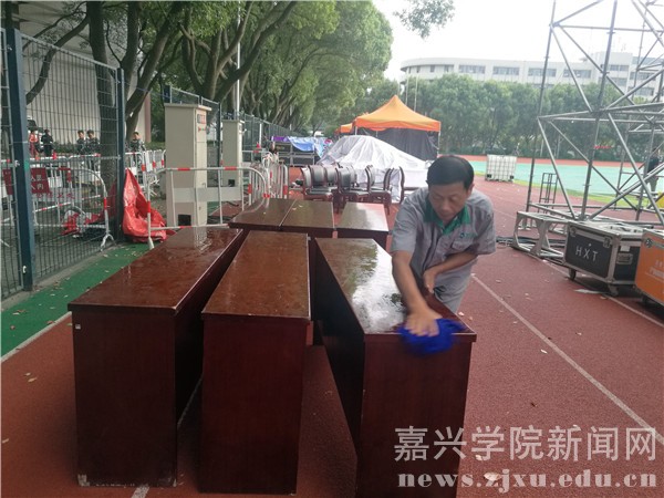 物业管理服务中心安排人力物力,加大垃圾清运、绿化修剪,完成了越秀体育场周边道路清洗、卫生清扫和绿植摆放等工作,为嘉宾和师生创造了干净整洁的校园环境,营造了良好的活动氛围。正逢台风“山竹”来袭,雷雨连连,物业管理服务中心工作人员冒着雷雨,抢抓时间,搬运摆放、清洁擦拭会场圆凳5800个,摆放雨衣7000件,并做好场地的安全检查。典礼结束后,保洁部员工全力清扫场地卫生;第二天一早又冒着大雨回收椅凳、清除垃圾,为整场开学典礼划上了一个圆满的句号,用行动祝愿大一新生们谱写一段美好的大学时光。