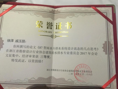 10月27日,浙江省勘察设计行业协会建筑给水排水专业委员会2017年会在宁波落幕,由我校建筑工程学院戚玉丽老师(指导教师)和建环专业徐泽同学合作完成的《87型雨水斗排水系统设计流态的几点思考》荣获论文三等奖。 在杭各知名设计院的给排水专业相关领导、专家,学会在编个人及企业会员代表400余人参会。 本次年会征集了近5年内的原创论文(包括其他刊物已发表的论文),经评审委员会评审评选出了特等奖1名,一等奖2名,二等奖5名,三等奖10名以及优胜奖12名。