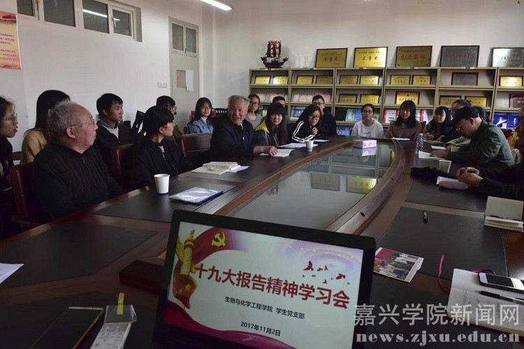 为了深入学习贯彻党的十九大精神,11月2日下午,由生化学院化学工程与工艺学生党支部、应用化学学生党支部共同举办的“十九大报告精神学习报告会”活动在梁林校区一号楼516教室举行。活动邀请到了嘉兴市新四军历史研究会杨巧云、吴询杰、张志宏、季语四位老同志,与同学们分享他们学习十九大报告精神的心得体会。学生党支部书记庄美燕、陈晶晶老师到场参加。