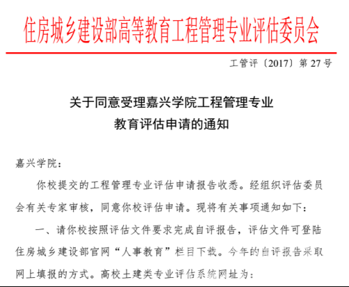 9月27日,住房与城乡建设部高等教育工程管理专业评估委员会下发《关于同意受理嘉兴学院工程管理专业教育评估申请的通知》(工管评【2017】第27号),同意受理我校工程管理专业教育评估。