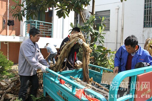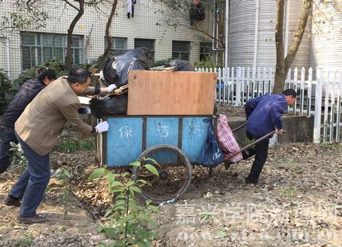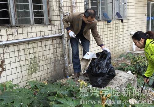 学生公寓⑷后面灌木丛生,掉落在灌木丛中的白色垃圾很难清理,又因化粪池经常满出,现场又脏又乱、臭气熏天。党员志愿者活动中,20余名党员发挥先锋模范作用,有的用铁锹清理粪便,有的用火钳夹出塑料袋,还有的甚至直接徒手捧杂物,清理了公寓内花园的烟蒂、白色塑料袋等丢弃物,彻底清除卫生死角。短短一个小时,清理出满满的两车垃圾。党员们不怕脏不怕苦,不放过每一个白色垃圾,不留下一块碎片,原本脏乱的地段又重新焕发了“美丽生机”。