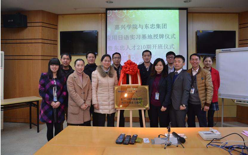 2015年12月28日,“嘉兴学院&东忠应用日语实训基地”授牌仪式在杭州“东忠”集团总部隆重举行。出席仪式的有东忠ES事业部部长陈邦挺、AW杭州ATソフト技术部部长永井孝明、东忠人才总经理许红纳、教学部部长朱艳、国际部部长郑晓燕、市场部部长王燕和嘉兴学院外国语学院院长陶玉丹、副院长喻锋平、日语系主任郭永恩、日语系老师畅宝仁以及此次参加实训的所有学生。