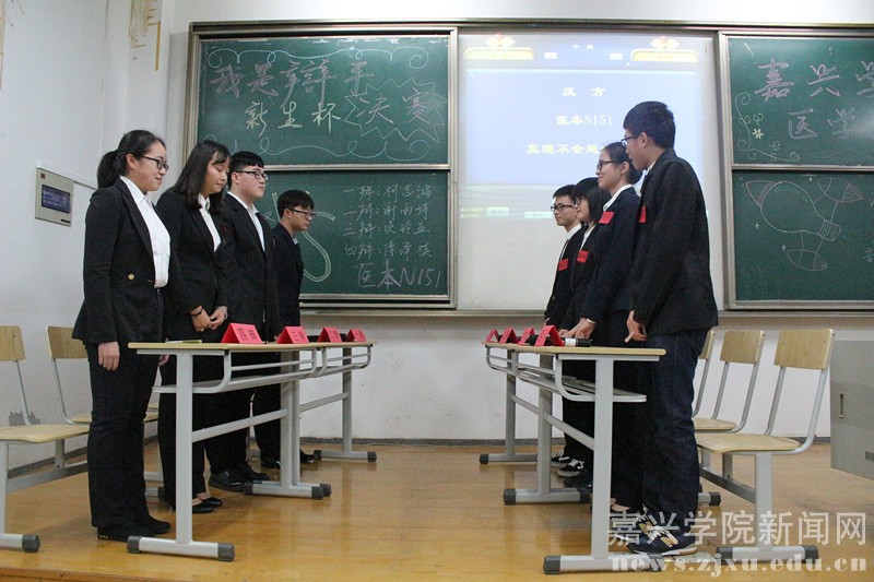 2015年12月20日晚,嘉兴学院医学院辩论赛在梁林校区一号楼221教室顺利进行。出席本次比赛的嘉宾有医学院学生会主席范佳俊、学生会副主席罗易、学生会副主席高青婷。担任本次辩论赛的评委有医学院现辩论队队长韩佳男、机电学院辩论队队长孙建新、数信学院辩论队副队长林展宇。