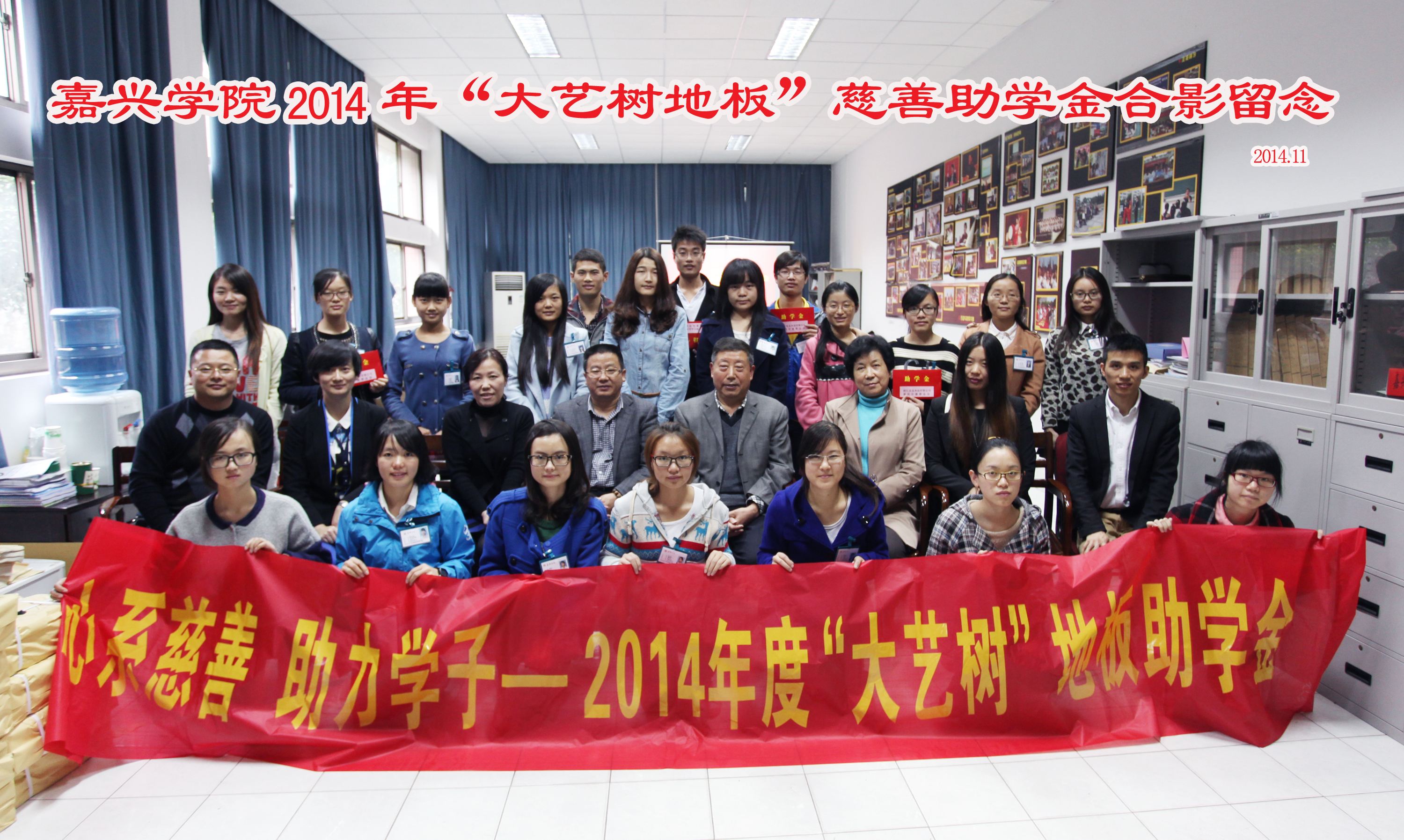 11月24日下午,2014年“大艺树地板”慈善助学金颁发仪式举行。浙江良友木业有限公司副总经理葛晓海先生一行,嘉兴市慈善总会副会长陈召秀先生以及商学院党委书记左军老师,接受资助的20名学子参加仪式。商学院党委副书记胡文蔚老师主持助学金颁发仪式。